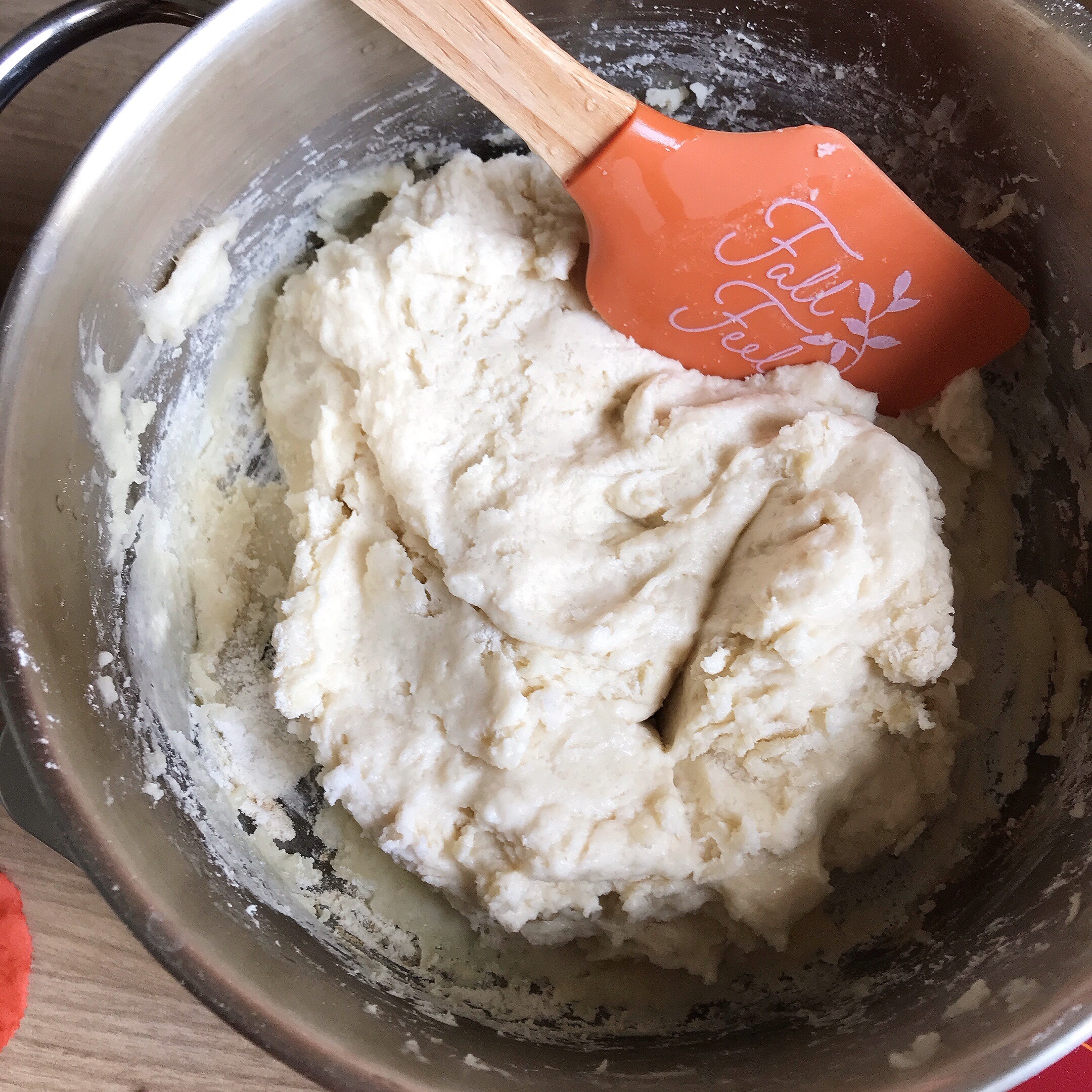 Once all your ingredients are combined, turn on your stove to medium-low heat and mix until the dough forms a ball. Add more flour or oil as needed. After its formed, place it on the countertop and let it cool.